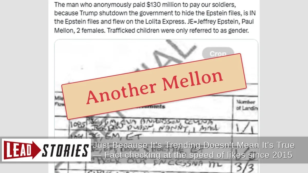 Показывают ли летные журналы, что человек, который анонимно пожертвовал 130 миллионов долларов, чтобы заплатить американским солдатам во время закрытия правительства США в октябре 2025 года, летал на самолете Лолиты Экспресс Джеффри Эпштейна? Нет, это не так: страница журнала полетов, цитируемая в сообщениях в социальных сетях, утверждающих, что страница журнала полетов, цитируемая в сообщениях о претензиях, показывает, что Пол Меллон, наследник банковского состояния Меллона, летал с Эпштейном между конной фермой Меллона в Вирджинии и Ричмондом, штат Вирджиния, 6 апреля 1998 года. Но Пол Меллон не мог быть донором с тех пор, как он умер в 1999 году. Пожертвование, как сообщается, поступило от Тимоти Меллона, его единственного сына.